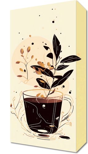 Obraz z serii minimalistyczne zatytułowany Jesienna Donica. Na obrazie widzimy czarną filiżankę pełną aromatycznej kawy, z której wyłania się roślinność w barwach jesieni. Tło w pastelowych beżach i brązach tworzy przytulną atmosferę, a drobne kropki i plamy nadają kompozycji dynamiki. Grafika oddaje ciepło i przytulność chłodniejszych dni, zapraszając do delektowania się chwilą w spokoju domowego zacisza. Idealny do wnętrz, które cenią sobie ciepłe akcenty i klimatyczne detale, pasuje do kawiarni, kuchni, lub jako element relaksującej przestrzeni w salonie.