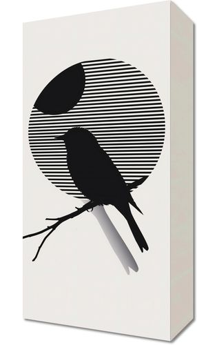 Obraz z serii minimalistyczne zatytułowany Kontrast Smukłości. Na grafice dominuje silna gra kontrastów i zdecydowanych linii. W centrum kompozycji wyróżnia się sylwetka ptaka o smukłych kształtach, którą rzucono na tło składające się z równoległych, poziomych linii. Ptak, osadzony solidnie na gałęzi, wyłania się z linii tła, tworząc efekt wizualnej głębi. Całość umieszczona jest w obrębie idealnie okrągłego kształtu, który przywodzi na myśl zarówno wschodzące słońce, jak i księżyc w pełni, podkreślając cykliczność i rytm natury. Zakorzeniony w estetyce modernizmu i japońskiej sztuki drzeworytu, obraz jest wyraźnie nowoczesny, lecz nawiązuje do wiecznych tematów natury i jej piękna. Doskonale sprawdzi się w minimalistycznych wnętrzach, gdzie każdy element dekoracyjny ma za zadanie przemawiać do obserwatora, inspirować i przynosząc wyciszenie.