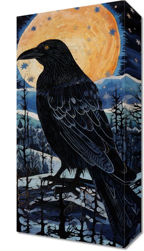 Obraz z serii abstrakcja zatytułowany Kruczy Mąciciel. Ta praca przedstawia majestatycznego kruka, który góruje nad zimowym lasem pod rozgwieżdżonym niebem. Tło, na którym widnieje wielka, pełna księżycowa aureola w złocistych i ciepłych odcieniach, kontrastuje z chłodnymi tonami niebieskiego i czerni, użytych do oddania tajemniczego krajobrazu i ptaka. Kruka cechuje szczegółowe przedstawienie piór, które dodaje tekstury i głębi, a jego silna postać emanuje spokojem i siłą. Obraz ten idealnie pasuje do przestrzeni, które celebrują naturę i jej mityczne aspekty, jak domowe biblioteki, salony w stylu eklektycznym lub pokoje z elementami boho, dodając im charakteru i wyjątkowości.