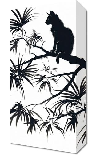Obraz z serii wnętrza zatytułowany Na Gałęzi przedstawia sylwetkę kota siedzącego na gałęzi, zarysowaną na tle jasnego, jednolitego tła. Całość kompozycji utrzymana jest w stylu sumi-e, nawiązującym do tradycyjnej wschodniej techniki tuszem. Kontury kota i roślin są wyraziste, z delikatnymi szczegółami, które przywodzą na myśl efekt cieniowania i głębi. W tle roślinność, prawdopodobnie bambus lub tropikalne palmy, jest przedstawiona w sposób stonowany, co wskazuje na użycie gradientu cieni. Grafika ta oddaje spokój i harmonię, charakterystyczne dla azjatyckiej estetyki i sztuki. Idealnie nadawałaby się jako dekoracja w przestrzeniach inspirowanych minimalizmem i naturą.