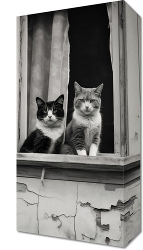Obraz z serii wnętrza zatytułowany Para w Oknie. Uchwycenie momentu, w którym dwa koty o spokojnych i pełnych godności spojrzeniach pozują w oknie zaniedbanej fasady. Czarno-białe tło fotografii dodatkowo wzmacnia ich wyraziste, charakterystyczne wzory na sierści. Ten obraz to nie tylko urokliwa scena z życia miejskich kotów, ale również piękna metafora o spokoju i zgodzie, jaką można odnaleźć w najprostszych momentach codzienności. Obraz ten będzie wyjątkowym dodatkiem do każdego wnętrza, szczególnie polecany dla miłośników zwierząt i estetyki vintage, a także jako element ozdobny w kawiarniach czy księgarniach, który wnosi element ciepła i domowego klimatu.