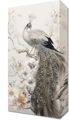 Obraz z serii wnętrza zatytułowany Pawia Gracja. Ta grafika przedstawia majestatycznego pawia spoczywającego na gałęzi, otoczonego przez delikatne kwiaty magnolii. Kunsztownie oddane detale piór i kwiatów w pastelowej palecie barw tworzą uczucie spokoju i harmonii. Obraz ten jest idealny dla miłośników piękna natury i sztuki, doskonale nadaje się do wnętrz o klasycznej i eleganckiej estetyce, takich jak salon, sypialnia, a także jako wyjątkowy element dekoracyjny w spa lub miejscach relaksacji.