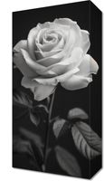 Obraz z serii wnętrza zatytułowany Płatki Róż. Obraz przedstawia ponadczasowy, monochromatyczny obraz róży. Róża, z delikatnymi i szczegółowymi płatkami, jest wyeksponowana na ciemnym tle, co wyostrza jej obrys i podkreśla subtelne niuanse jej formy. Gra światła i cienia nadaje głębi i trójwymiarowości, a ułożenie płatków w pełnym rozkwicie symbolizuje piękno i doskonałość. Liście i łodyga są skromne, ale wyraźne, dodając naturalności całej kompozycji. Obraz oddaje esencję delikatności i elegancji róży, co sprawia, że jest idealny dla każdego, kto szuka elementu dekoracyjnego o subtelnym pięknie i spokojnej, relaksującej estetyce.