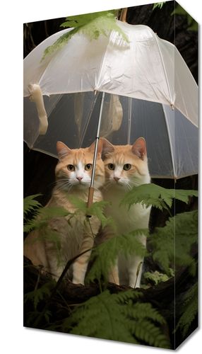 Obraz z serii wnętrza zatytułowany Podwójna Ochrona przedstawia dwie urocze, rude koty szukające schronienia pod przezroczystym parasolem, który zdaje się być koroną zielonej paproci. Ich symetryczne odbicie w połyskliwej strukturze parasola dodaje głębi i charakteru kompozycji. Ciepłe odcienie futra kotów kontrastują z ciemnym, zielonym tłem, co sprawia, że stają się centralnym punktem obrazu. Ich spojrzenia są skierowane prosto w obiektyw, co nadaje fotografii osobisty i intymny charakter. To zdjęcie idealnie uchwyciło moment spokoju i ochrony w naturalnym otoczeniu, a zarazem subtelnie podkreśla więź między dwoma zwierzętami. Idealne do wnętrz o domowym, ciepłym charakterze, zarówno dla miłośników kotów, jak i miłośników przyrody.