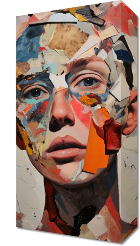 Obraz z serii abstrakcja zatytułowany Podział Samego Siebie, przedstawia twarz złożoną z rozmaitych, nieregularnych kawałków, które łączą się w zaskakująco spójną całość. Każdy fragment jest jak pociągnięcie pędzla, pełne tekstury i żywych kolorów, od ciepłych odcieni pomarańczy i czerwieni, po subtelne biel i brąz. Wzrok widza jest przyciągany do intensywnych, realistycznych oczu, które wydają się obserwować z za rozdrobnionej mozaiki. Obraz ten mógłby znaleźć swoje miejsce w nowoczesnych galeriach sztuki, studiach projektowych, lub jako odważny akcent w minimalistycznych, współczesnych przestrzeniach. Jego abstrakcyjny, ale wyrazisty design stwarza punkt konwersacyjny i może być interpretowany jako komentarz do złożoności ludzkiej tożsamości i percepcji.