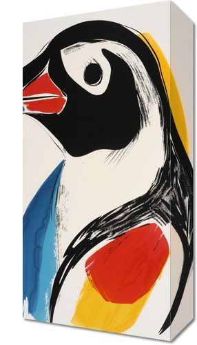 Obraz z serii abstrakcja zatytułowany Portret Ptaka. Prezentuje on stylizowany obraz ptaka, być może maskonura, z charakterystycznym dużym okiem i kolorowym dziobem. Artysta użył odważnych, geometrycznych kształtów i intensywnych barw, aby uchwycić esencję ptaka w prosty, ale wpadający w oko sposób. Duże bloki czerni, błękitu, czerwieni i żółci są zastosowane z lekkością pociągnięć pędzla, co nadaje dziełu lekkości i dynamiki. Ten obraz jest świadectwem tego, jak minimalizm może w pełni wyrazić piękno natury, będąc jednocześnie współczesnym i śmiałym elementem w każdym wnętrzu, od domowych przestrzeni po nowoczesne biura.