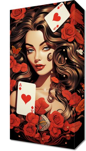 Obraz z serii abstrakcja zatytułowany Różany Hazard. Ta bogato zdobiona grafika przedstawia portret kobiety z królewskim spokojem, otoczoną przez wirujące karty z sercami i rozkwitające czerwone róże. Jej włosy płynnie przechodzą w kwiatowe motywy, a spojrzenie jest pełne tajemnicy i uroku. Motyle i drobne perełki dodają kompozycji element fantazji i delikatności. Wszystko to na tle głębokiej czerni, która eksponuje intensywność kolorów i detali. Obraz ten jest idealny dla przestrzeni, które chcą dodać element romantyzmu i wyrafinowania, jak eleganckie sypialnie, prywatne kolekcje czy luksusowe salony. Jego barwna paleta i symboliczne elementy sprawiają, że jest to dzieło, które przyciąga wzrok i pobudza wyobraźnię. BLEJTRAMABlejtrama, na którą naciągane jest płótno, wykonana jest z naturalnego drewna sosnowego. To mocne i solidne drewno stanowi jedno z najbardziej ekologicznych rozwiązań, gdyż jest łatwe w obróbce. Dodatkowym atutem jest fakt, że sosna rośnie w Polsce, co gwarantuje lokalną obróbkę materiału. Obraz na takiej blejtramie jest trwały i wytrzymały. Ramki do zdjęć nie są wliczone w cenę wydruku. Jeśli chcesz je nabyć, prosimy o dokonanie zakupu oddzielnie.ZADRUKOWANE BOKIKażdy egzemplarz charakteryzuje się zadrukowanymi bokami, co umożliwia zawieszenie obrazu na ścianie bez potrzeby dodatkowej oprawy.