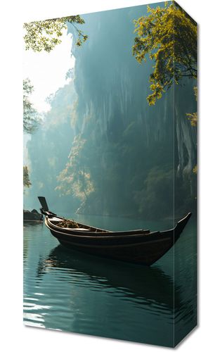 Obraz z serii pejzaże zatytułowany Samotność na Tafli przedstawia idylliczny krajobraz, w którym centralnym punktem jest drewniana łódka unosząca się na spokojnych wodach jeziora. Otoczona przez majestatyczne, zielone drzewa i klify, które otulają wodę jak opiekuńcze ramiona, scena ta jest utrzymana w ciepłych, naturalnych barwach. Promienie słoneczne przebijają się przez liście, tworząc efekt tajemniczego światła i cieni na wodnej tafli. Całość kompozycji wywołuje uczucie spokoju i kontemplacji, idealnie oddając atmosferę zacisznego zakątka, oderwanego od zgiełku codzienności. Obraz ten będzie pasował do wnętrz, które pragną podkreślić łączność z naturą i stworzyć oazę spokoju, takich jak gabinety relaksacyjne, pokoje medytacyjne czy nawet jako spokojny akcent w nowoczesnych biurach.