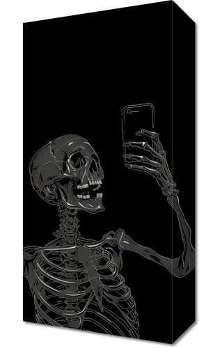 Obraz z serii abstrakcja zatytułowany Selfie Poza Czasem. Grafika przedstawia szkielet, który trzyma smartfon, pozując do autoportretu. Zarysy szkieletu na czarnym tle tworzą silny wizualny kontrast, podkreślający ironiczny komentarz na temat współczesnej obsesji na punkcie mediów społecznościowych i samowiedzy. Ten obraz łączy w sobie humor z głębszą refleksją nad ludzką egzystencją i naszą cyfrową erą, co czyni go prowokującym dodatkiem do każdej nowoczesnej przestrzeni, takiej jak studio, salon, czy pokój młodzieżowy. Idealny dla tych, którzy cenią sobie sztukę z przesłaniem oraz dla przestrzeni kreatywnych szukających unikatowych akcentów.