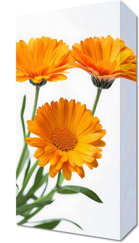 Obraz z serii wnętrza zatytułowany Słoneczne Kalendule. Zaprezentowano na nim trzy jaskrawe, żywiołowe kwiaty kalenduli, które rozkwitają na tle czystej bieli. Ich intensywnie pomarańczowe płatki i wyraziste, bogate środki stanowią symbol radości i optymizmu. Delikatne cienie i gra światła na płatkach dodają głębi i realizmu, sprawiając, że kwiaty wydają się niemal trójwymiarowe. Ten obraz może wprowadzić element natury i świeżości do każdego wnętrza, będąc idealnym wyborem dla przestrzeni, które cenią sobie jasność i lekkość, takich jak salony, pokoje relaksacyjne czy kliniki wellness.