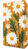 Obraz z serii wnętrza zatytułowany Słoneczny Ogród. Bujne białe stokrotki z wyraźnie zarysowanymi, złotymi środkami stoją dumnie na ciepłym, pomarańczowym tle. Zielone liście i łodygi tworzą kontrast, dodając głębi i życia kompozycji. Urok tych kwiatów podkreślony jest przez detale, takie jak subtelne cienie i gradienty. Te promienne i wesołe stokrotki emanują optymizmem i radością. Świetnie sprawdzi się w kawiarniach o rustykalnym stylu, domowych sypialniach dla tych, którzy pragną wprowadzić do swojej przestrzeni odrobinę słońca, czy też w biurach, gdzie chce się przynieść odrobinę natury.
