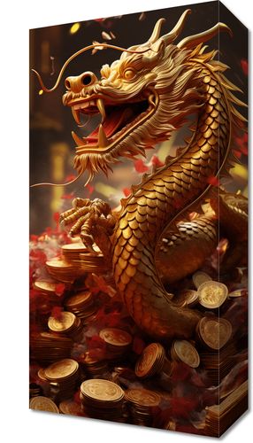 Obraz z serii motywy wschodnie zatytułowany Smok Bogactwa. Ilustracja ta ukazuje potężnego złotego smoka, symbol siły i pomyślności w wielu kulturach wschodnich, unoszącego się nad skarbami. Smok, z szeroko otwartymi szczękami, wydaje się ryczeć triumfalnie, otoczony przez wirujące złote monety i kwiaty, co dodaje kompozycji dynamizmu. Żywe kolory i szczegółowe wykonanie smoka sprawiają, że obraz jest pełen życia i energii. Obraz ten jest doskonałym wyborem dla miłośników sztuki orientalnej oraz jako element dekoracyjny wnętrz, które chcą wprowadzić elementy bogatej symboliki i kulturowej głębi, takich jak domowe biura, pokoje do medytacji czy ekskluzywne salony.