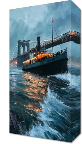 Obraz z serii abstrakcja zatytułowany Stary Parowiec uchwycił nostalgiczny obraz starego parowca przemierzającego wody przy mrocznym niebie, z tłem rozświetlonego mostu. Światła na parowcu rzucają ciepły blask na fale, tworząc złoty refleks na powierzchni wody, co kontrastuje z chłodnymi odcieniami burzowych chmur i zmierzchu. To malownicze przedstawienie, połączone z dynamiczną grą świateł i cieni, tworzy romantyczną i pełną atmosfery scenę, która przyciąga oko i wywołuje uczucie sentymentu do dawnych czasów. Idealnie nadaje się do zawieszenia w przestrzeniach, gdzie chcemy dodać element historycznej elegancji i marzycielskiego nastroju, takich jak biblioteki, studia, a nawet salony.