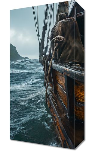 Obraz z serii pejzaże zatytułowany Statek na Falach to dramatyczna scena przedstawiająca statek przemierzający wzburzone fale oceanu. Zwrócony w stronę niespokojnych wód, statek o klasycznej konstrukcji z drewnianymi burtami i linami, wydaje się być zanurzony w przygodzie lub ekspedycji. Twardy, odwrócony tyłem marynarz, ubrany w przeciwdeszczowy płaszcz, wpatruje się w horyzont, dodając elementu ludzkiego do dzikiego i nieokiełznanego krajobrazu morskiego. Szarozielone klify w oddali stanowią tło dla sceny, podkreślając surowość i izolację otoczenia. Ten obraz może wnieść atmosferę przygody i odkryć do każdego wnętrza, będąc szczególnie odpowiednim dla przestrzeni pełnych charakteru, takich jak gabinet, pokój tematyczny w stylu podróżniczym lub nawet jako akcent w stylowym barze lub restauracji nawiązującej do tematyki morskiej.