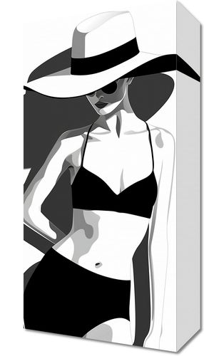 Obraz z serii abstrakcja zatytułowany Strój. Prezentuje stylizowany czarno-biały wizerunek kobiety w dwuczęściowym stroju kąpielowym. Postać odziana jest w szerokobrzmiony kapelusz, który rzuca cień na jej twarz, podkreślając elegancki i tajemniczy charakter kompozycji. Kobieta stoi w pozycji trzy czwarte, z jedną ręką opuszczoną wzdłuż ciała, a drugą lekko zgiętą w łokciu, co dodaje dynamizmu ilustracji. Obraz jest utrzymany w minimalistycznym stylu z wykorzystaniem płaskich plam kolorów i wyraźnych linii, co nadaje mu nowoczesny i modny wygląd. Ten rodzaj grafiki idealnie wpasuje się w nowoczesne wnętrza, szczególnie te o monochromatycznej kolorystyce, lub jako modny akcent w przestrzeniach o minimalistycznej estetyce.