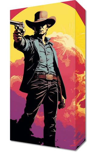 Obraz z serii pop art zatytułowany Strzelec z Epoki. Ten obraz przedstawia postać klasycznego kowboja w akcie wystrzału, z tłem wschodzącego słońca, które rozświetla scenę w ciepłych odcieniach czerwieni i pomarańczy. Silny kontrast i zdecydowane linie wydobywają charakterystyczne cechy postaci, od kapelusza po detale na szelkach i pasie. Obraz ten jest hołdem dla kultury westernów i bezkresnych amerykańskich przestrzeni, idealny dla miłośników historii i kinematografii, a także jako wyrazisty element dekoracyjny w miejscach takich jak domy, bary tematyczne lub sale kinowe.