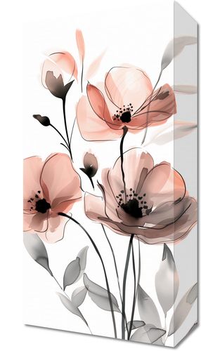 Obraz z serii wnętrza zatytułowany Subtelny Okaz to artystyczna interpretacja delikatnych kwiatów maku. Ilustracja przedstawia kwiaty w pastelowych odcieniach różu i pomarańczy z subtelnymi szarości i akcentami czerni, co nadaje kompozycji miękkiego i eterycznego charakteru. Przezroczyste płatki z lekko zarysowanymi konturami są przedstawione na tle w tonacji jasnego beżu, co pozwala na pełne skupienie na delikatności i pięknie kwiatów. Wykorzystanie minimalizmu i delikatności kolorów sprawia, że obraz emanuje spokojem i elegancją. Idealny do przestrzeni, które cenią sobie spokój i naturę, takich jak salony spa, pokoje gościnne, czy jadalnie, gdzie może dodać odrobinę subtelnego uroku i świeżości.