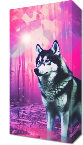 Obraz z serii pop art zatytułowany Wilczy Duch. Ta hipnotyzująca grafika łączy w sobie realistyczny wizerunek wilka z eterycznym, neonowym lasem w tle, co nadaje scenie onirycznego, mistycznego charakteru. Wilk, przedstawiony w pełnym majestacie, stoi na brzegu zaczarowanego jeziora, a tajemnicze, geometryczne kształty unoszą się w powietrzu, dodając kompozycji elementu fantastyki. Wyraziste kolory różu i fioletu tworzą niemal bajkową atmosferę. Obraz jest idealnym wyborem dla miłośników natury i jej mistycznych aspektów, świetnie nadaje się do wnętrz o tematyce przyrodniczej, pokojów dla młodzieży, lub jako unikatowy element dekoracyjny w przestrzeniach współczesnych.