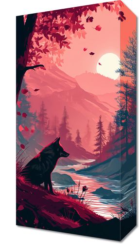 Obraz z serii abstrakcja zatytułowany Wilk Przy Brzegu Lasu przedstawia urzekającą scenę, w której wilk stoi na brzegu lasu, wpatrując się w odległy zachód słońca. Idylliczny krajobraz ukazuje rzekę wijącą się między drzewami, a w tle majestatyczne góry przybierające ciepłe odcienie zachodzącego słońca. Niebo w odcieniach różu i pomarańczy odbija się w spokojnych wodach rzeki, tworząc lustrzane odbicie, które dodaje głębi kompozycji. Spadające liście z drzew o ciepłych, jesienno-czerwonych barwach, wirują wokół wilka, dodając dynamiki i uczucia zmienności pór roku. Ten plakat idealnie wpasuje się w wnętrza o tematyce natury i dzikiej przyrody, takie jak pokoje o tematyce przyrodniczej, przestrzenie wypoczynkowe, a także jako inspirujący element dekoracyjny w biurach i domowych gabinetach, przypominając o sielskich i spokojnych aspektach życia.