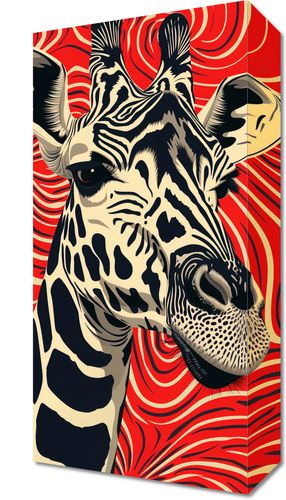 Obraz z serii pop art zatytułowany Wzrok Żyrafy. Grafika ukazuje żyrafę na tle hipnotyzującego wiru w odcieniach czerwieni, który zdaje się pulsować energią i życiem. Wzór tego tła przypomina afrykańskie słońce lub ciepłe prądy powietrza unoszące się nad sawanną. Ciemne, wyraziste kontury żyrafy kontrastują z żywym tłem, akcentując jej unikalne cechy i łagodne spojrzenie. Obraz ten może być inspirującym dodatkiem do każdego wnętrza, szczególnie do przestrzeni urządzonych w duchu przygody lub afrykańskiej estetyki, a także świetnie sprawdzi się jako element edukacyjny w pokojach dziecięcych czy klasach szkolnych.