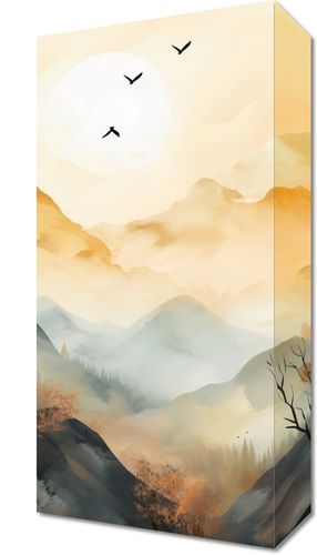 Obraz z serii pejzaże zatytułowany Zorza Świtania. Ciepłe, pastelowe barwy przedstawiające góry skąpane w świetle wschodzącego słońca, które rzutuje złote i bursztynowe odcienie na krajobraz. Cienie migrujących ptaków przecinają olśniewający blask, dodając elementu wolności i nieograniczoności. Delikatne światła mrugające w oddali sugerują odległe wioski lub miasteczka. Ten spokojny i medytacyjny krajobraz świetnie sprawdzi się w salonach spa, pokojach wypoczynkowych lub biurach, gdzie chce się przynieść uczucie spokoju i harmonii.