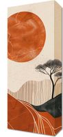 Obraz z serii boho zatytułowany Afrykański Zachód Słońca przedstawia malowniczą scenę z ciepłymi, ziemistymi barwami symbolizującymi niekończącą się pustynię. Wielkie, płonące słońce w kolorze rdzy wisi nad delikatnie zarysowanymi drzewami akacji, które są ikoniczne dla afrykańskiego krajobrazu. Linie konturów wzgórz i pustynnych wydm dodają głębi i perspektywy, a rysunkowe pęknięcia i plamy na słońcu nadają teksturę. Ta kompozycja łączy surowość pustyni z zachwycającym pięknem dzikiej przyrody, idealna dla wnętrz, które pragną odrobiny egzotyki i ciepła afrykańskich barw.