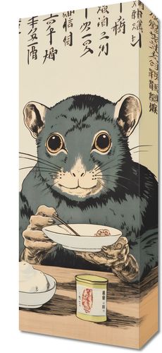 Obraz z serii motywy wschodnie zatytułowany Chwila Refleksji. Intrygujące spojrzenie gryzonia w tradycyjnym stroju, podkreślane przez błękitną tunikę i precyzyjne detale, które nadają mu humanoidalnego charakteru. Czerwone naczynia oraz kanji w tle kontrastują z jasnymi barwami obrazu, dodając nuty głębi i dziedzictwa kulturowego. Subtelna gra światła i cienia na stoliku z jedzeniem i napojem wzbogaca kompozycję i zachęca do refleksji nad połączeniem tradycji z nowoczesnością. Świetnie sprawdzi się w kawiarniach o azjatyckim klimacie, galeriach sztuki oraz w przestrzeniach dedykowanych kulturze Wschodu.