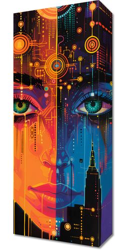 Obraz z serii abstrakcja zatytułowany Cyfrowa Psyche. Przedstawia fascynującą symetrię między ludzką urodą a technologicznym zawirowaniem. Wyraźne, zielone oczy kobiety są centralnym punktem obrazu, ożywione wizją elektronicznych obwodów i cyfrowych sygnałów, które przepływają przez i wokół jej wizerunku. Przecinające twarz linie symbolizują połączenie osobowości z nowoczesnymi technologiami, podczas gdy tło ukazuje zarys charakterystycznego krajobrazu miejskiego. Intensywne, neonowe kolory od pomarańczowego do niebieskiego nadają dziełu dynamiczny i nowoczesny charakter. Obraz ten będzie idealnym dodatkiem do współczesnych biur, salonów gier lub innych przestrzeni kreatywnych, które celebrują połączenie sztuki i technologii.
