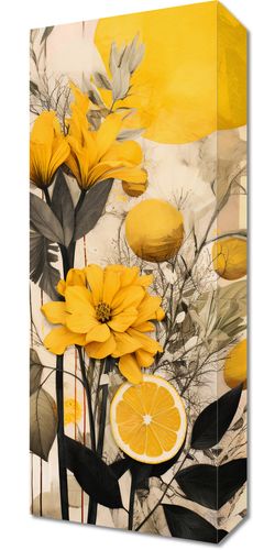 Obraz z serii wnętrza zatytułowany Cytrusowy Zachwyt. Fascynująca kompozycja ukazująca kwitnące żółte kwiaty, zmysłowe odcienie i niuanse przyrody w harmonii z cytrusowymi motywami. Plener wypełniony jest pełnymi życia kolorami, gdzie świeżo pokrojony cytrynowy plaster przeplata się z lśniącymi kroplami rosy i subtelnie opadającymi liśćmi. Całość skąpana jest w cieple żółtego słońca, dodając obrazowi nuty świeżości i optymizmu. Doskonale sprawdzi się w kawiarniach o letnim klimacie, salonach kosmetycznych lub w przestronnych jadalniach z elementami roślinności w dekoracji.