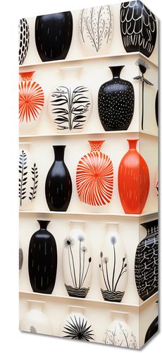 Obraz z serii wnętrza zatytułowany Gliniana Harmonia. Precyzyjnie ułożone wazony na półkach prezentują się niczym w muzeum sztuki użytkowej. Ich geometryczne i roślinne wzory, oscylujące między czernią, bielą i czerwienią, tworzą hipnotyzującą kompozycję. Prostota i elegancja tych przedmiotów, w połączeniu z ich zróżnicowaną fakturą i wzornictwem, dodają wnętrzom niepowtarzalnego charakteru. Idealnie komponują się zarówno w nowoczesnych loftach, jak i tradycyjnych pokojach kolekcjonera. Ta estetyczna kolekcja doskonale odda atmosferę w galeriach designu oraz w ekskluzywnych salonach z antykami.