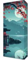 Obraz z serii motywy wschodnie zatytułowany Japoński Pawilon. Ten obraz emanuje spokojem dzięki scenie przedstawiającej tradycyjny japoński pawilon, otoczony przez wodę i delikatnie pochylające się czerwone liście klonu. Ciepłe światło wschodzącego księżyca i subtelne odbicie w wodzie podkreślają atmosferę ciszy i refleksji. Delikatne sylwetki przelatujących ptaków dodają element życia i ruchu. Obraz ten idealnie wpisuje się w przestrzenie współczesne, minimalistyczne, a także te, które celebrują naturę i spokój, takie jak pokoje do medytacji, jadalnie, czy też poczekalnie w spa.