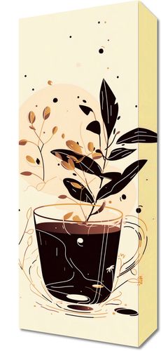 Obraz z serii minimalistyczne zatytułowany Jesienna Donica. Na obrazie widzimy czarną filiżankę pełną aromatycznej kawy, z której wyłania się roślinność w barwach jesieni. Tło w pastelowych beżach i brązach tworzy przytulną atmosferę, a drobne kropki i plamy nadają kompozycji dynamiki. Grafika oddaje ciepło i przytulność chłodniejszych dni, zapraszając do delektowania się chwilą w spokoju domowego zacisza. Idealny do wnętrz, które cenią sobie ciepłe akcenty i klimatyczne detale, pasuje do kawiarni, kuchni, lub jako element relaksującej przestrzeni w salonie.
