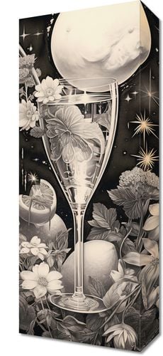 Obraz z serii wnętrza zatytułowany Kosmiczny Eliksir. Niesamowita kompozycja przedstawiająca kieliszek, z którego wylewa się galaktyczny nektar, otoczony kwiatami i roślinami w monochromatycznych barwach. Centralnym punktem jest lśniąca pełnia księżyca, której blask odbija się w szkle, tworząc atmosferę tajemnicy i magii. Gwiazdy migoczą w tle, nadając całości głębokiego, nieskończonego wymiaru. Delikatne linie i szczegóły graficzne wzbogacają kompozycję, czyniąc ją idealnym wyborem do nowoczesnych salonów, galerii sztuki oraz miejsc o tematyce astronomicznej.