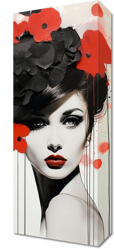 Obraz z serii wnętrza zatytułowany Kwiatowa Pasja. Magnetyczne spojrzenie kobiety zaakcentowane jest eksplozją czerwonych i czarnych kwiatów, które zdają się być przedłużeniem jej duszy. Jej soczyste czerwone usta są echem barwnych petali, które otaczają ją niczym aura. Splaty czerwieni na monochromatycznym tle dodają kompozycji dynamiki i nieprzewidywalności. Idealnie odnajdzie się w luksusowych apartamentach oraz w eleganckich salonach kosmetycznych.