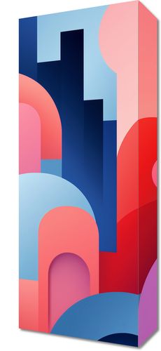 Obraz z serii geometria zatytułowany Miasto Kolorów. Złożone z różnorodnych kształtów i tonacji, przedstawiające wyimaginowane miasto pełne zakamarków i mostów. Błękitne wieżowce kontrastują z ciepłymi różami i czerwieniami, tworząc uczucie ruchu i dynamiki. Gładkie linie i łuki wprowadzają uczucie spokoju w środku urbanistycznego zgiełku. Doskonale odnajdzie się w nowoczesnych biurach oraz w przestrzeniach artystycznych galerii.