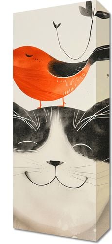 Obraz z serii abstrakcja zatytułowany Pyzaty Przyjaciel przedstawia uroczą, minimalistyczną ilustrację czarno-białego kota z zamkniętymi oczami i szerokim uśmiechem, na którego głowie spoczywa radosny, czerwony ptaszek. Kot ma charakterystyczne białe obszary wokół pyszczka, na którym wyraźnie rysują się czarne wąsy i delikatny nos. Ptaszek wydaje się być zadowolony, śpiewający, z zamkniętymi oczkami, co dodaje kompozycji wesołego i spokojnego nastroju. Tło jest jasne, z subtelnymi plamami i kropkami, które mogą imitować subtelny efekt spękanego płótna lub papieru. Po lewej stronie, na górze, widoczna jest wschodnia pieczęć, co nadaje pracy szczyptę orientalnego charakteru. Ta grafika mogłaby być idealnym, ciepłym dodatkiem do przestrzeni domowej, zwłaszcza do pokoju dziecka lub jako element dekoracyjny w przestrzeni wspólnej, przynoszący uśmiech i poczucie spokoju.