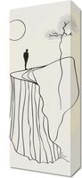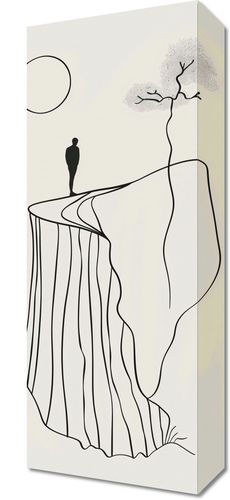 Obraz z serii minimalistyczne zatytułowany Samotność i Wzniosłość prezentuje zamyśloną postać stojącą na skraju urwiska, pod wielką pustą przestrzenią symbolizowaną przez prosty, geometryczny krąg. Obok, krucha i delikatna drzewina wyrasta ze skały, kontrastując z monumentalnością sceny. Ten obraz łączy w sobie elementy natury i ludzkiej refleksji, wykorzystując czyste linie do przedstawienia zarówno siły, jak i kruchości życia. Obraz przemawia swoją prostotą i głębią, będąc idealnym wyborem dla przestrzeni, które aspirują do wywołania uczucia kontemplacji i inspiracji, jak medytacyjne przestrzenie, minimalistyczne biura, czy domowe biblioteki.