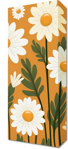 Obraz z serii wnętrza zatytułowany Słoneczny Ogród. Bujne białe stokrotki z wyraźnie zarysowanymi, złotymi środkami stoją dumnie na ciepłym, pomarańczowym tle. Zielone liście i łodygi tworzą kontrast, dodając głębi i życia kompozycji. Urok tych kwiatów podkreślony jest przez detale, takie jak subtelne cienie i gradienty. Te promienne i wesołe stokrotki emanują optymizmem i radością. Świetnie sprawdzi się w kawiarniach o rustykalnym stylu, domowych sypialniach dla tych, którzy pragną wprowadzić do swojej przestrzeni odrobinę słońca, czy też w biurach, gdzie chce się przynieść odrobinę natury.
