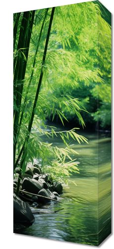 Obraz z serii natura zatytułowany Spokój Bambusów. Ukazuje on idylliczny zakątek przyrody, gdzie zielone pędy bambusa delikatnie zginają się nad błogim, spokojnie płynącym strumieniem. Gra światła i cienia na liściach bambusa tworzy wrażenie głębi i spokoju, zaś szemrząca woda dodaje uczucie świeżości i czystości. Ten obraz oddaje piękno i spokój odosobnionego zakątka natury, jest więc idealny dla przestrzeni relaksacyjnych takich jak spa, pokoje do medytacji lub jako ukojenie w zgiełku codzienności w domowych wnętrzach. To doskonała dekoracja dla tych, którzy pragną wprowadzić element natury i harmonii do swojego otoczenia.