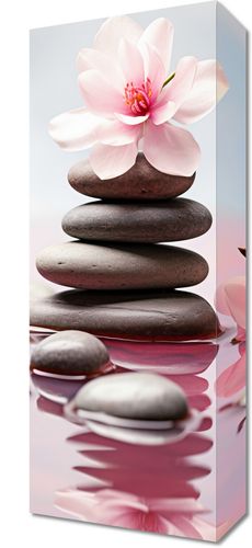 Obraz z serii natura zatytułowany Spokojne Odbicie. Delikatność różowego kwiatu doskonale kontrastuje z ciemnymi, gładkimi kamieniami, tworząc obraz pełen równowagi i spokoju. Lustro wody odbija symetrię kwiatu, podkreślając jego subtelność i kruchść, jednocześnie oddając uczucie głębi. Delikatne tło dodaje eteryczności i lekkości kompozycji. Ten relaksujący i wyciszający obraz doskonale sprawdzi się w spa, gabinetach masażu oraz w pomieszczeniach medytacyjnych, gdzie panować ma atmosfera spokoju i harmonii.
