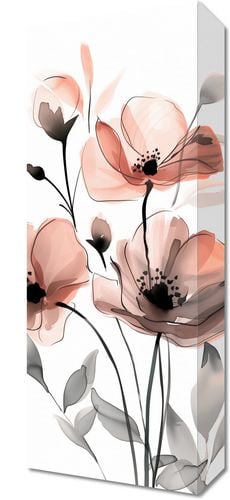 Obraz z serii wnętrza zatytułowany Subtelny Okaz to artystyczna interpretacja delikatnych kwiatów maku. Ilustracja przedstawia kwiaty w pastelowych odcieniach różu i pomarańczy z subtelnymi szarości i akcentami czerni, co nadaje kompozycji miękkiego i eterycznego charakteru. Przezroczyste płatki z lekko zarysowanymi konturami są przedstawione na tle w tonacji jasnego beżu, co pozwala na pełne skupienie na delikatności i pięknie kwiatów. Wykorzystanie minimalizmu i delikatności kolorów sprawia, że obraz emanuje spokojem i elegancją. Idealny do przestrzeni, które cenią sobie spokój i naturę, takich jak salony spa, pokoje gościnne, czy jadalnie, gdzie może dodać odrobinę subtelnego uroku i świeżości.