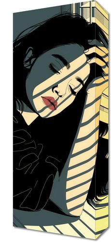 Obraz z serii abstrakcja zatytułowany Zamysł. Obraz przedstawia kobietę z zamyślonym wyrazem twarzy, z głową opartą na dłoni, co sugeruje moment introspekcji lub smutku. Silne cienie i linie świetlne tworzące prążki na jej twarzy dodają głębi kompozycji, a kontrastująca paleta kolorów z dominującymi odcieniami niebieskiego i czerni, podkreślona akcentem czerwieni ust, potęguje emocjonalne napięcie dzieła. Ten obraz może symbolizować skomplikowane emocje ludzkiego doświadczenia i jest idealnym dodatkiem do przestrzeni, które cenią sobie głębię i wyrazistość w sztuce, takich jak salon, studio twórcze, czy miejsce do medytacji.