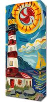 Obraz z serii abstrakcja zatytułowany Żywa Przystań to wesoła i barwna ilustracja przedstawiająca latarnię morską w nadmorskim pejzażu. Wyraziste, kręte linie i żywe kolory nadają scenie energii i ruchu, a dynamiczne słońce z żaglówką na tle morskich fal tworzy optymistyczny obraz. Latarnia morska, z jej klasycznymi czerwono-białymi pasami, stoi dumnie obok uroczego żółtego domku, a całość jest otoczona przez stylizowane kwiaty i roślinność. Styl przypomina ekspresjonistyczne dzieła z początku XX wieku, pełne życia i radości. Ten obraz jest idealny do rozjaśnienia każdego pomieszczenia, nadając mu ciepła i pozytywnej energii, świetnie sprawdzi się w przestrzeniach takich jak salony, pokoje dziecięce czy miejsca publiczne, gdzie może wprowadzić atmosferę spokoju i radosnego spędzania czasu.