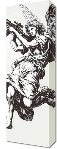 Obraz z serii pop art zatytułowany Anioł Wojny. Przedstawia on postać anioła w klasycznym stylu, jednak z nieoczekiwanym elementem współczesnym – trzyma on broń, co jest zaskakującym połączeniem tradycyjnej symboliki z nowoczesnymi motywami. Ta silna wizualna metafora może prowokować do refleksji na temat konfliktów, pokoju i dwoistości natury ludzkiej. Zastosowanie monochromatycznej kolorystyki wzmacnia dramatyzm kompozycji, a sama praca może stanowić wyrazisty akcent w nowoczesnych przestrzeniach, które cenią sobie głęboką symbolikę i odważne wyraz artystyczny.