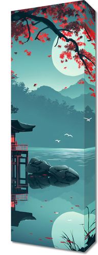 Obraz z serii motywy wschodnie zatytułowany Japoński Pawilon. Ten obraz emanuje spokojem dzięki scenie przedstawiającej tradycyjny japoński pawilon, otoczony przez wodę i delikatnie pochylające się czerwone liście klonu. Ciepłe światło wschodzącego księżyca i subtelne odbicie w wodzie podkreślają atmosferę ciszy i refleksji. Delikatne sylwetki przelatujących ptaków dodają element życia i ruchu. Obraz ten idealnie wpisuje się w przestrzenie współczesne, minimalistyczne, a także te, które celebrują naturę i spokój, takie jak pokoje do medytacji, jadalnie, czy też poczekalnie w spa.