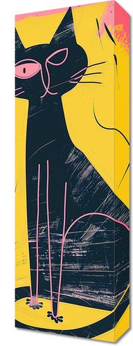 Obraz z serii abstrakcja zatytułowany Kontrastowa Kotka. Praca artystyczna przedstawia stylizowaną, abstrakcyjną sylwetkę czarnego kota na tle żywych, nieregularnych pociągnięć pędzla w odcieniach różu i żółci. Wzrok kota, zaznaczony jednym dużym różowym okiem, przyciąga uwagę i dodaje kompozycji charakteru. Mocne, geometryczne linie i intensywne kontrasty kolorystyczne tworzą nowoczesną i dynamiczną ilustrację, która przyciąga wzrok i staje się wyrazistym elementem dekoracyjnym. Obraz ten idealnie sprawdzi się w przestrzeniach miejskich, takich jak nowoczesne mieszkania, studia graficzne lub awangardowe kawiarnie, nadając wnętrzom śmiałości i wyjątkowego, artystycznego akcentu.