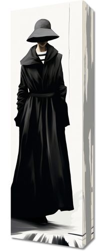 Obraz z serii wnętrza zatytułowany Mroczna Taina. Enigmatyczna postać w czarnym płaszczu i szerokim kapeluszu ukrywa swoją tożsamość, podkreślając aura tajemniczości. Czarno-białe tło z pionowymi smugami przypominającymi deszcz lub płynący atrament dodaje głębi i dramatyzmu kompozycji. Subtelne niuanse światła i cienia grają na powierzchni płaszcza, tworząc atmosferę intrygi i nieokreślonego niebezpieczeństwa. Świetnie sprawdzi się w nowoczesnych galeriach sztuki, luksusowych hotelach o minimalistycznym designie oraz w przestrzeniach przeznaczonych dla miłośników noir i kryminałów.