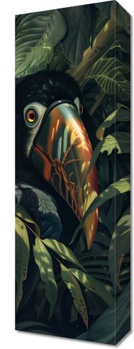 Obraz z serii natura zatytułowany Skryty Tukan przedstawia zaskakujący i intensywny portret tukana, zanurzonego w gęstej, tropikalnej zieleni. Ptak ma swoje charakterystyczne, kolorowe dziob w odcieniach pomarańczy i czerni, który odbija światło, tworząc efekt lustrzanego odbicia. Jego przenikliwe oko, obserwujące widza, dodaje głębi i charakteru kompozycji. Otaczające go rośliny są pełne detali, z subtelnymi gradiencjami kolorów i światłocieni, co tworzy efekt trójwymiarowości i ukrycia. Ta ilustracja emanuje tajemnicą tropikalnego lasu, gdzie natura i dzikie zwierzęta współistnieją w delikatnej równowadze. Obraz ten jest idealny dla przestrzeni, które cenią sobie piękno natury i chcą wprowadzić element dzikiej, nieujarzmionej przyrody do swojego otoczenia.