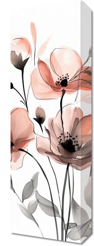 Obraz z serii wnętrza zatytułowany Subtelny Okaz to artystyczna interpretacja delikatnych kwiatów maku. Ilustracja przedstawia kwiaty w pastelowych odcieniach różu i pomarańczy z subtelnymi szarości i akcentami czerni, co nadaje kompozycji miękkiego i eterycznego charakteru. Przezroczyste płatki z lekko zarysowanymi konturami są przedstawione na tle w tonacji jasnego beżu, co pozwala na pełne skupienie na delikatności i pięknie kwiatów. Wykorzystanie minimalizmu i delikatności kolorów sprawia, że obraz emanuje spokojem i elegancją. Idealny do przestrzeni, które cenią sobie spokój i naturę, takich jak salony spa, pokoje gościnne, czy jadalnie, gdzie może dodać odrobinę subtelnego uroku i świeżości.