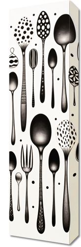 Obraz z serii wnętrza zatytułowany Narzędzia Smaku. Eleganckie sylwetki sztućców w różnorodnych kształtach i wzorach, podkreślane przez subtelne detale i geometryczne punkty, tworzą harmonijną i równocześnie zaskakującą kompozycję. Czarne i białe tony nadają prostotę i wyrafinowanie, podczas gdy unikalne projekty sztućców dodają nuty kreatywności i innowacji. Idealnie sprawdzi się w nowoczesnych kuchniach, restauracjach o minimalistycznym designie oraz w przestrzeniach dedykowanych sztuce kulinarnej.